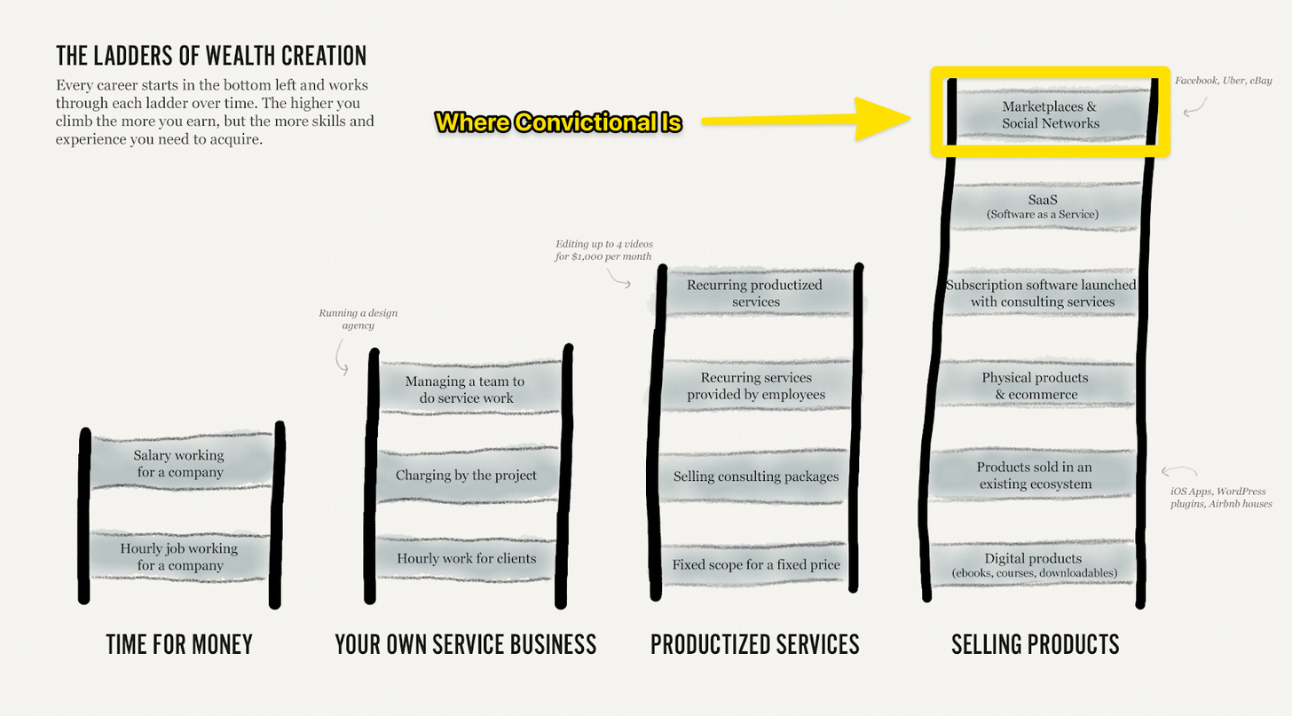 Working at Convictional removes the impact, reward, and difficulty ceilings for my career. Working at a company frees me from distractions like cashflow, bookkeeping, and client pipelines that take my attention away from a singular goal — marketing an IPO-worthy idea. The company is also (thankfully) 100% remote so I’m still in charge of my own schedule.