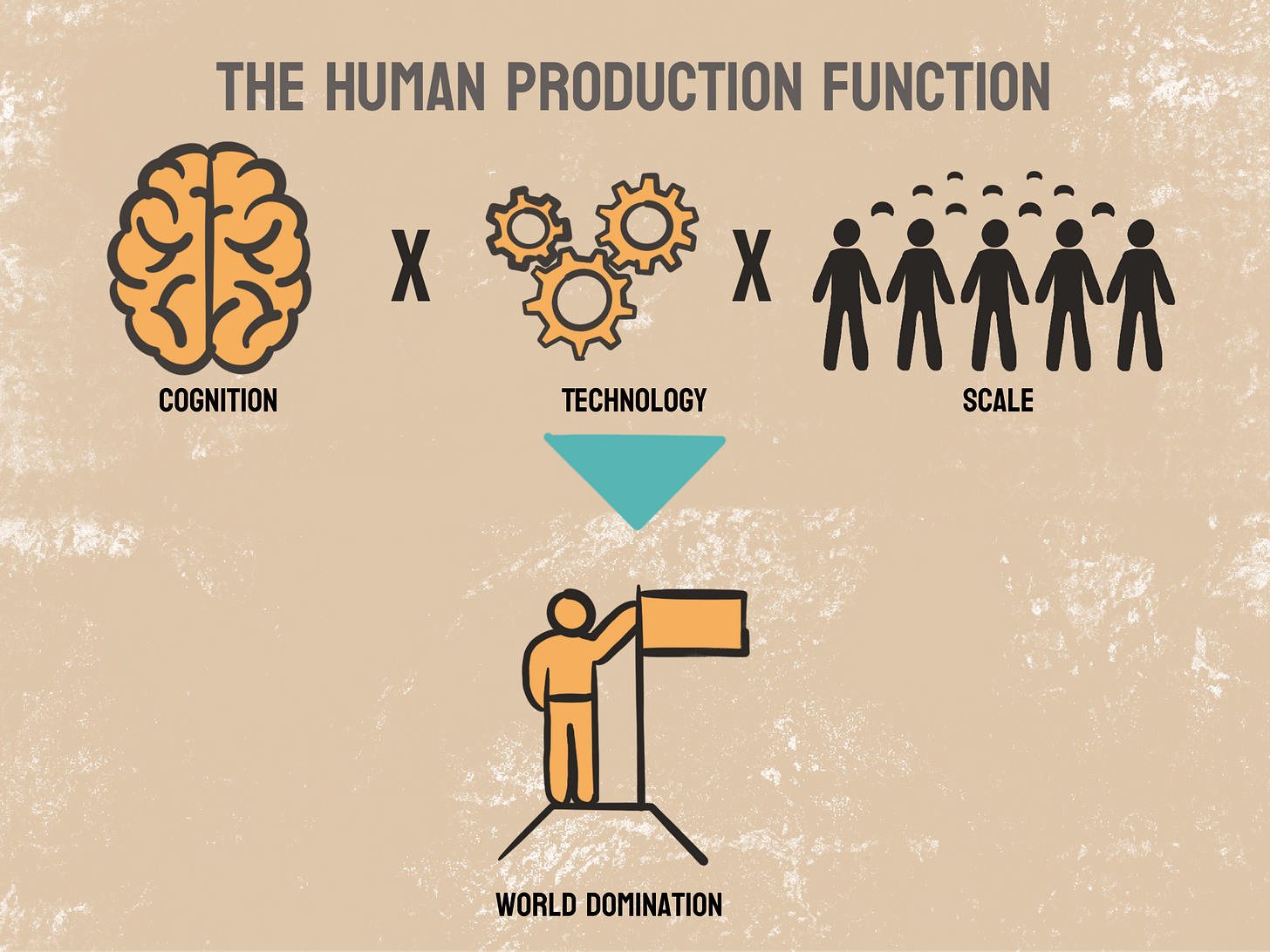 As control freaks with weak bodies, we humans used our Big Brainpower, multiplied by technology and sheer numbers to wage war on the rest of the planet. Let’s call this the Human Control Freak Production Function.